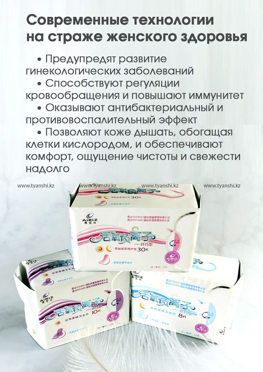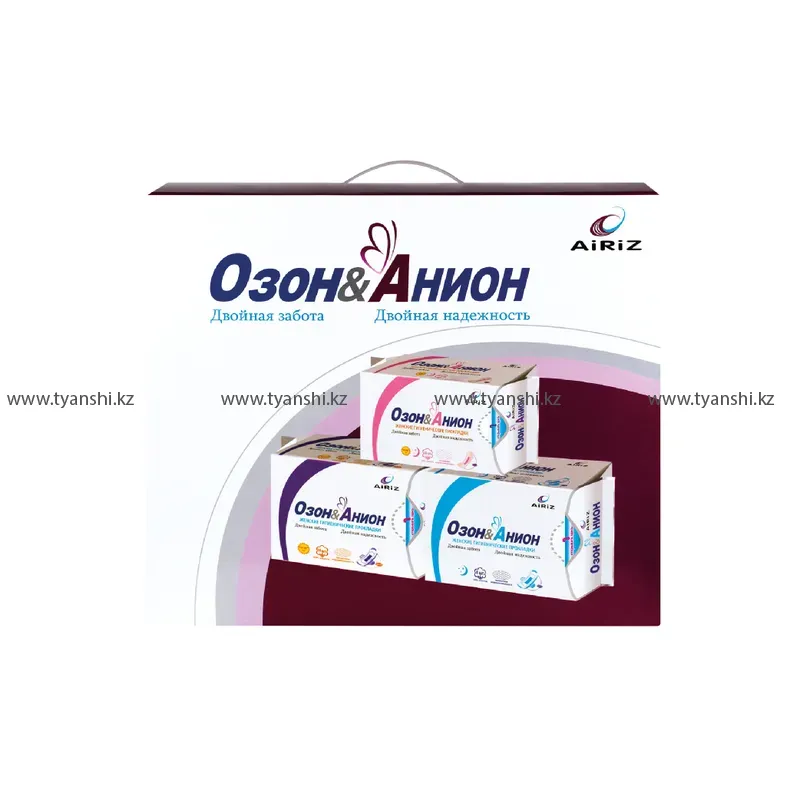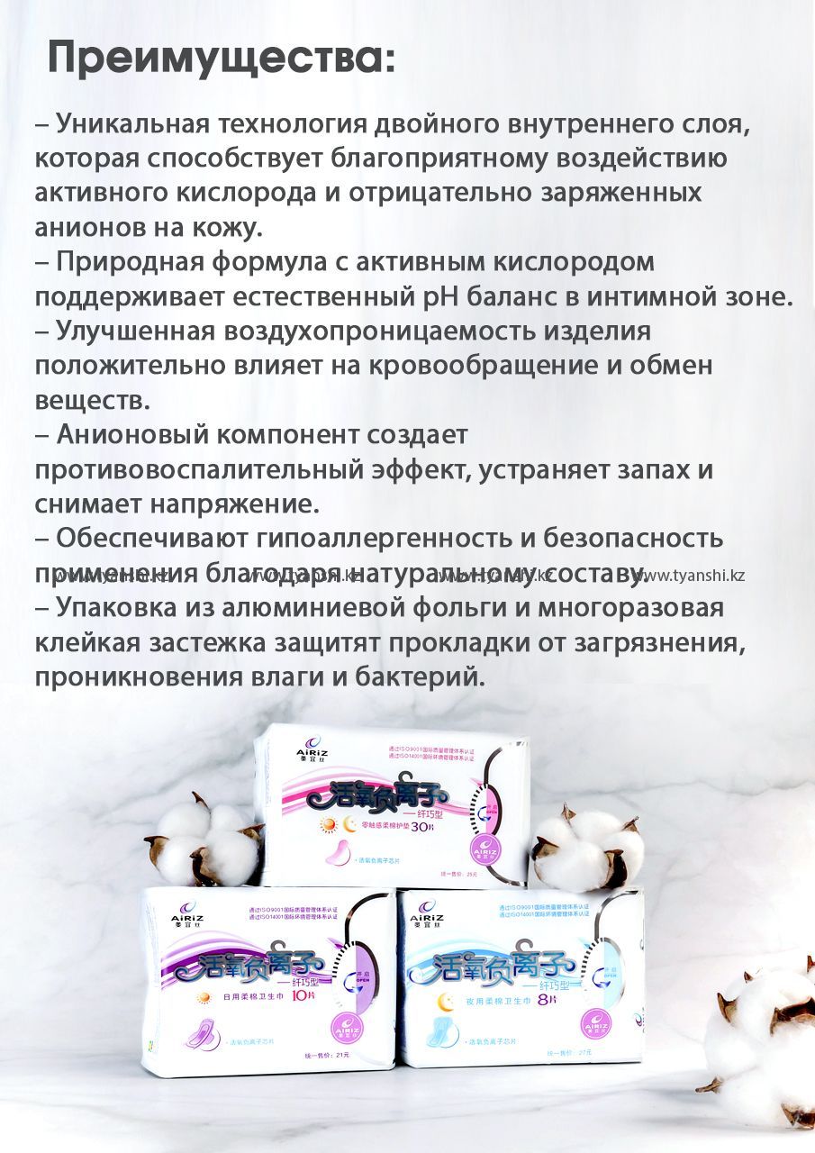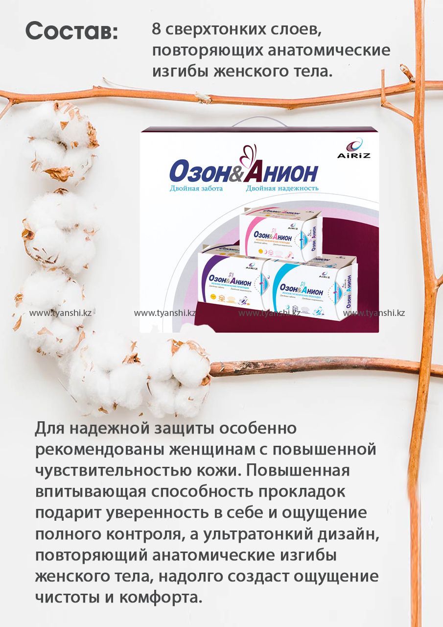 «AIRIZ» «озон и анион» – набор ультратонких женских гигиенических прокладок с активным кислородом и отрицательно заряженными ионами. технология двойного внутреннего слоя прокладок обеспечивает профилактику гинекологических заболеваний, регулирование кровообращения, повышение иммунитета.